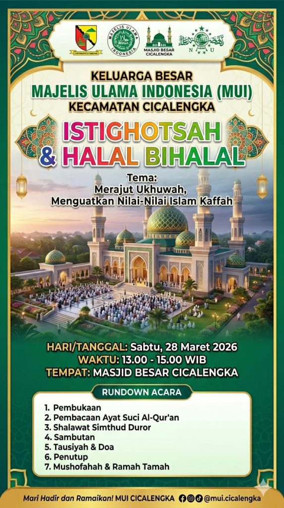 CICALENGKA, KAB. BANDUNG – Dalam rangka mensyukuri momentum Hari Raya Idul Fitri 1447 H, Keluarga Besar Majelis Ulama Indonesia (MUI) Kecamatan Cicalengka akan menyelenggarakan agenda rutin tahunan bertajuk “Istighotsah & Halal Bihalal”. Acara ini dijadwalkan berlangsung pada Sabtu, 28 Maret 2026, bertempat di Masjid Besar Cicalengka.